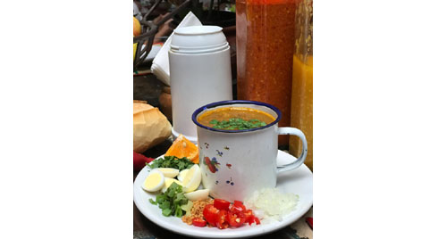 O prato é servido da forma como os pescadores levam para o barco para se alimentar durante o trabalho, em garrafas térmicas com acompanhamentos e temperinhos para fazer a diferença.